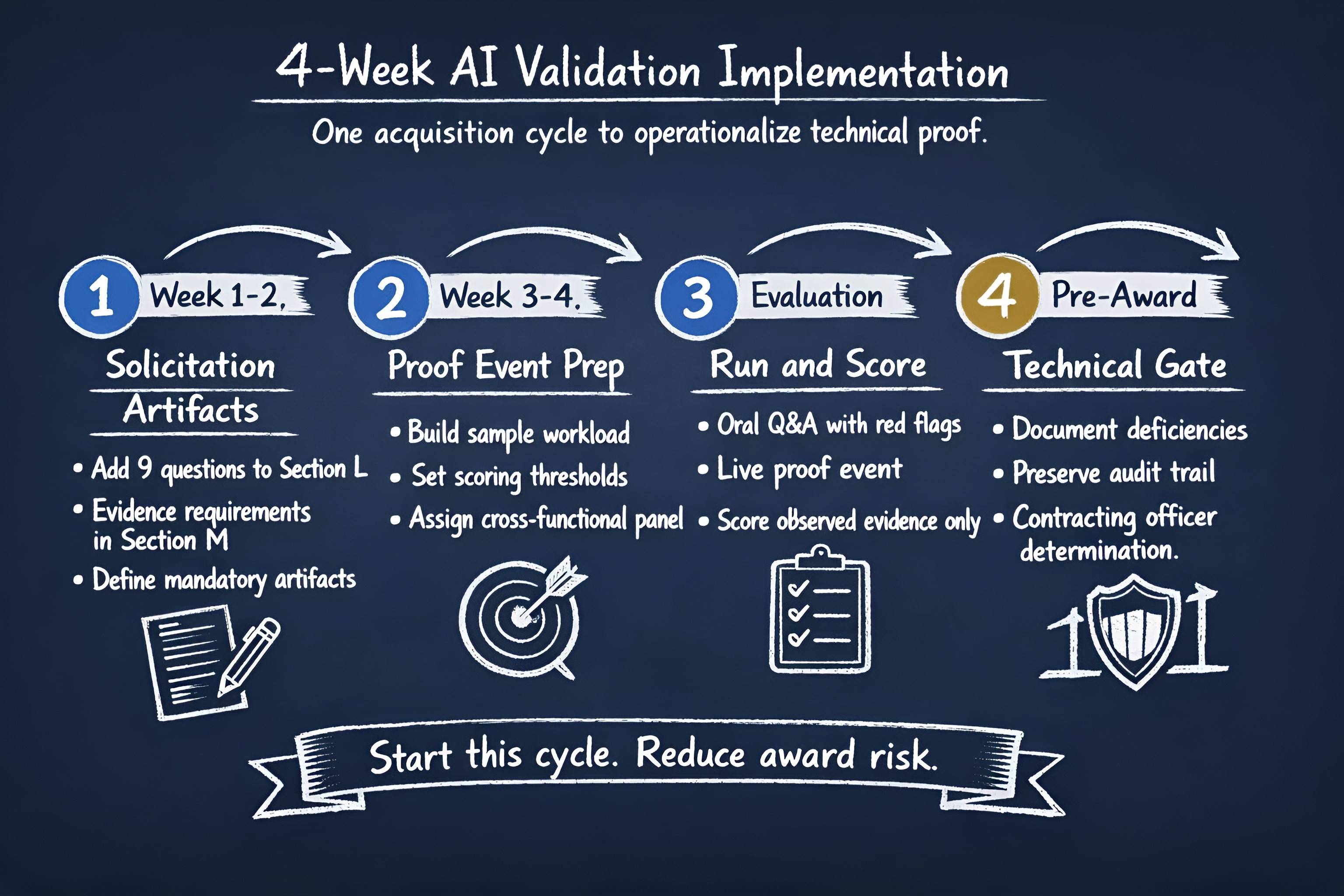 | 1 | Week 1-2: Insert validation language into solicitation artifactsAdd the nine questions to Section L response instructions. Add evidence requirements to Section M technical scoring. Define mandatory artifacts (architecture map, metrics, data rights statement, control mapping). |