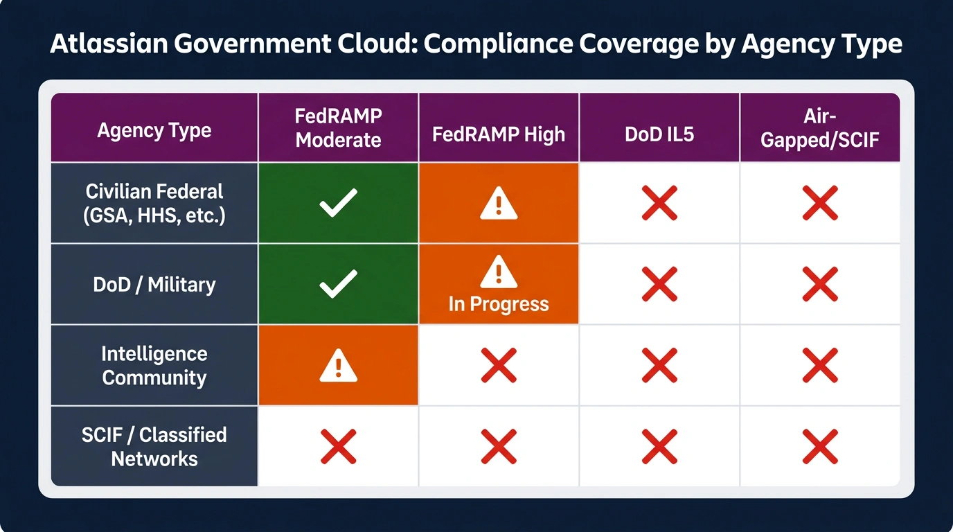 Atlassian Government Cloud achieved FedRAMP Moderate authorization in March 2025, sponsored by GSA. That's a meaningful step forward, but if your agency falls under DoD, the Intelligence Community, or handles national security data, FedRAMP Moderate isn't sufficient. You need FedRAMP High or DoD Impact Level 5 (IL5) authorization.
