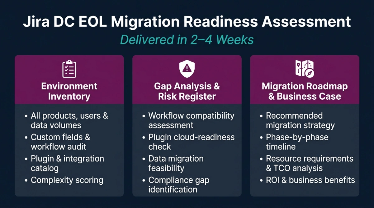The first step is straightforward: get a clear picture of what you have. Inventory your Atlassian environment: products, users, custom fields, workflows, plugins, integrations, and data volume. Identify the customizations that will need redesign. Determine your compliance requirements. Bring in your PMO, IT security, and procurement teams early.