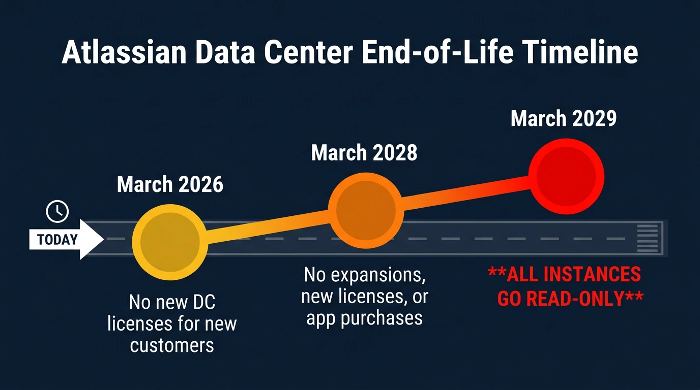 On September 8, 2025, Atlassian announced the end-of-life for all Data Center (DC) products, effective March 28, 2029. On that date, every Jira, Confluence, and Jira Service Management (JSM) Data Center instance goes read-only.